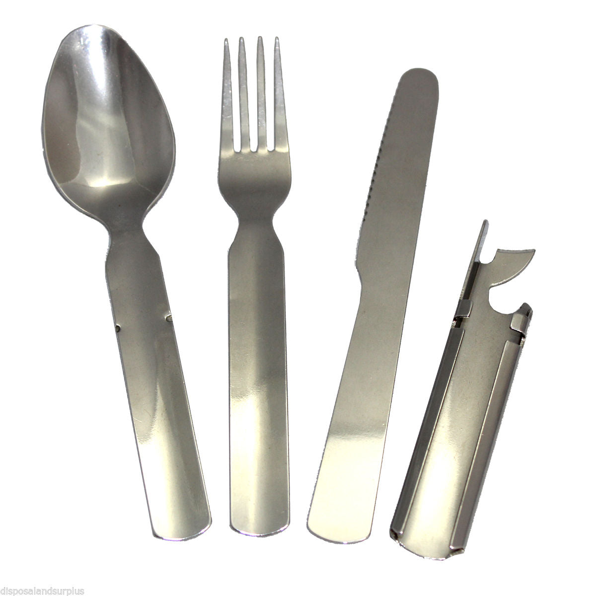 1 x Knife / Fork / Spoon set- Specifications: heavy duty stainless steel knife fork spoon set, conveniently packs into housing which can be used as bottle opener rrp: $9.95