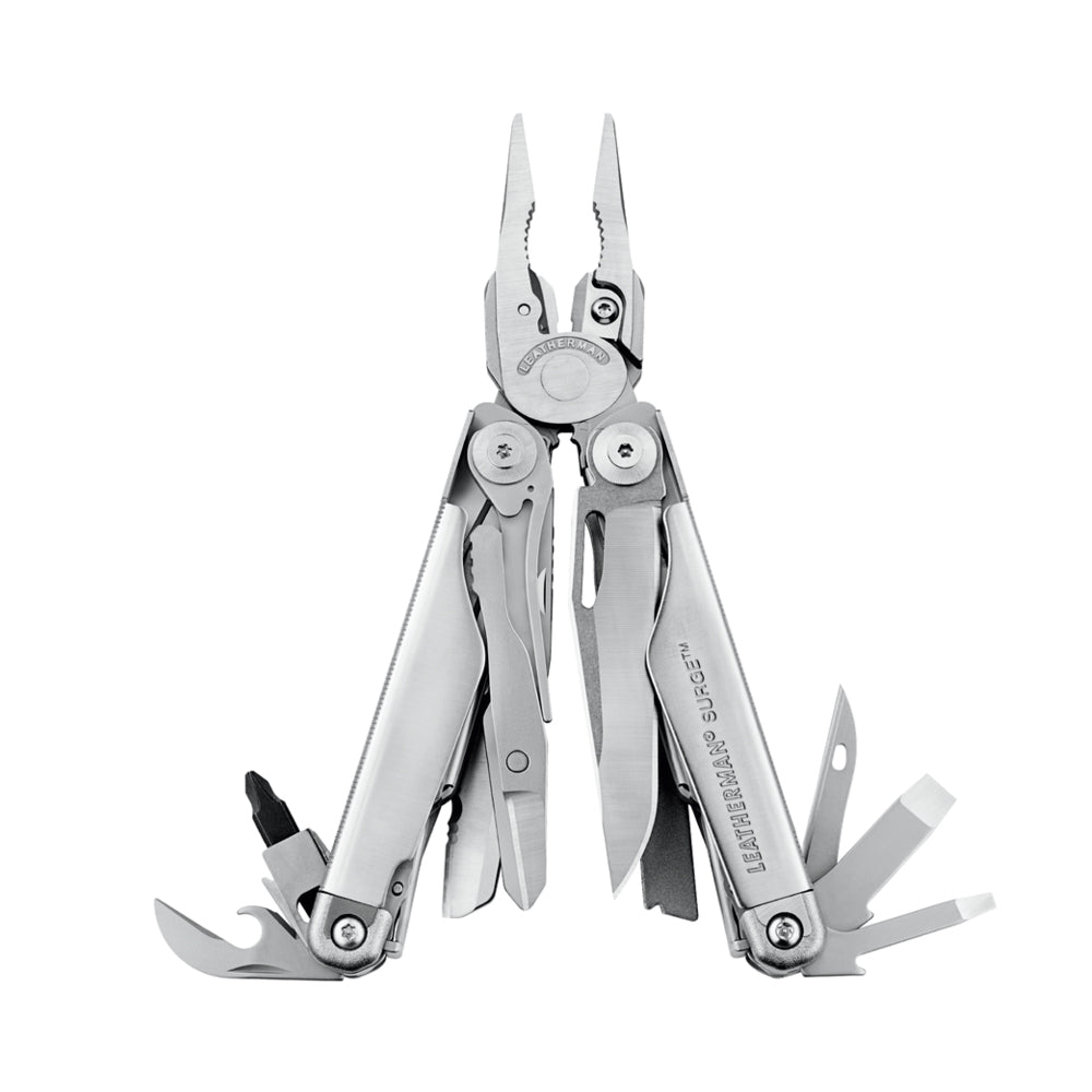 The Leatherman Surge is one of our two largest multi-tools; a real powerhouse, built with our largest pliers, longest multi-tool blades and easy-to-use locks. A unique blade exchanger, replaceable 154 cm wire cutters and four outside-opening blades give you quick access to the tools you use most. The Surge was built for tough jobs and the hands that do them.