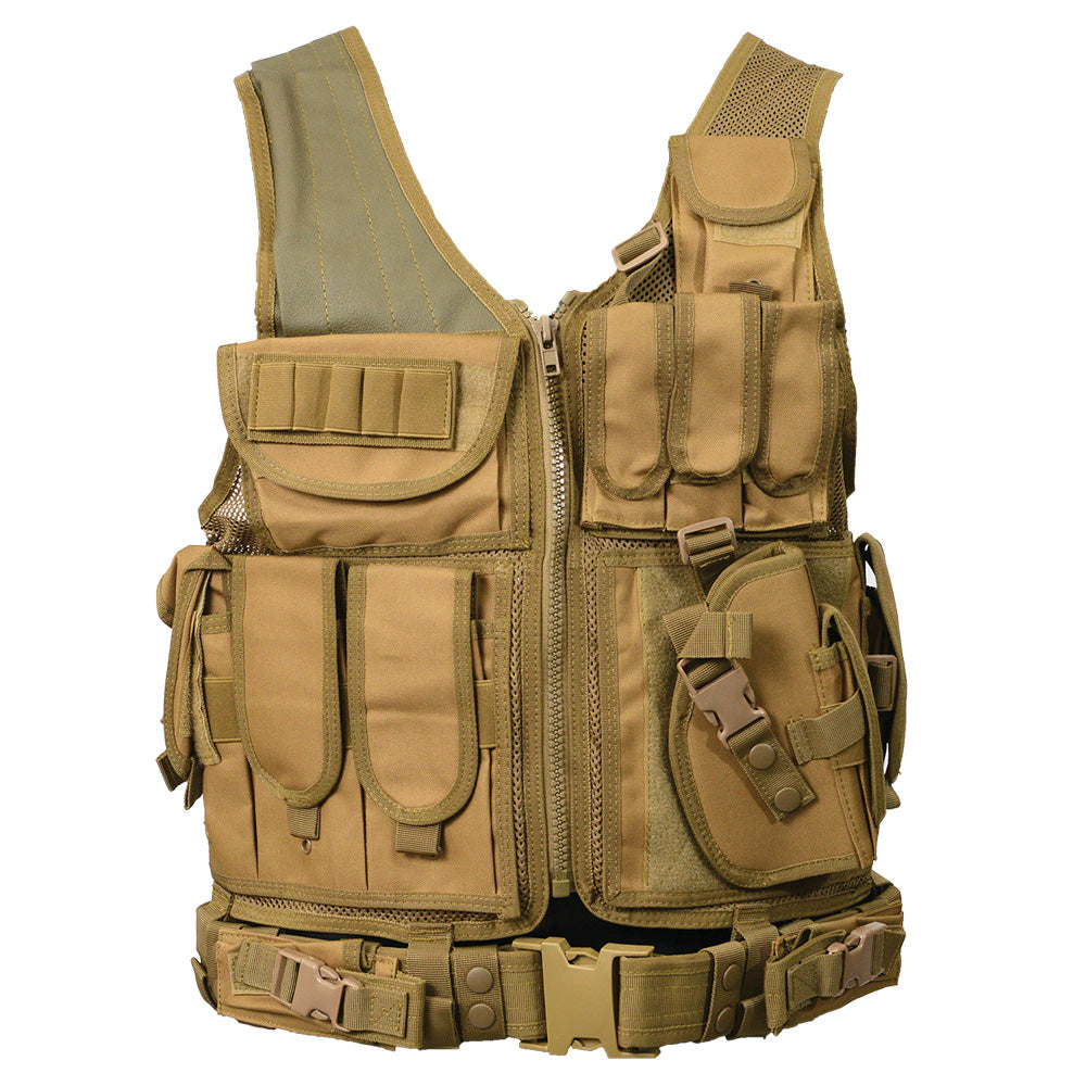 This vest has mesh backing. Left Side features detachable shotgun shell holder, utility pouch, 3 magazine pouches. Right side features 3 x Gadget pouch, detachable gun pouch, tactical torch pouch. Also features a phone pouch, rear mesh pocket for hydration bladder and 2 x internal document pouches.